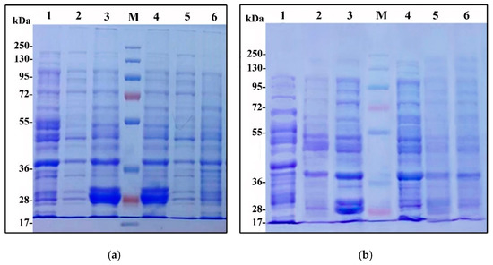Additionally, the changes in glutenin content characterised by SDS gel electrophoresis are presented in Figure 1a,b. SDS-PAG analysis revealed the occurrence of some differences between the two investigated cultivars during the two manipulated dates. SDS-PAGE analyses of total glutenin polypeptides of Gemmeiza and Shandaweel wheat genotypes showed the presence of both high and low molecular glutenin subunits. The results also showed that cv. Gemmeiza 9 genotype comprises high glutenin subunits with a molecular weight of about 138 to 40 kDa in normal and late sowing wheat grain flour, respectively, compared with Shandaweel. Meanwhile, the Gemmeiza genotype exhibited a greater amount of high-molecular-weight glutenin subunits at the region of about 138 KDa compared with the Shandaweel genotype. On the other hand, the exposure of Gemmeiza and Shandaweel wheat genotypes to heat stress induced by late sowing stimulated marked reductions in the accumulation of glutenin subunits.