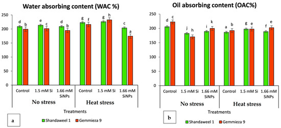 On the other hand, heat-induced stress during the late season significantly reduced the flour–oil absorbing capacity (OAC) of the two investigated wheat cultivars (Figure 2b). The application of Si and nanosilicon significantly increased the OAC of the flour of stressed wheat grains exposed to the late season compared with those of normal sowing plants.