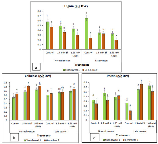 Effects of silicon and nanosilicon on (a) lignin, (b) cellulose and (c) pectin contents in straw of two wheat cultivars cv. Shandaweel 1 and cv. Gemmeiza 9 at normal and late seasons. Data expressed as (g/1g DW). Each value is the main of three different replicates ± SE. Columns with different letters are significantly different at p < 0.05.