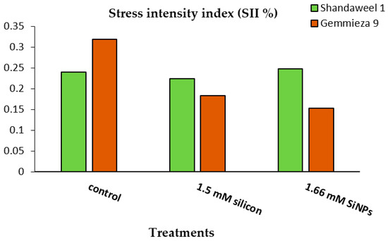 Moreover, the stress intensity index was greater in cv. Gemmeiza 9 compared with cv. Shandaweel 1 (Figure 4). Foliar application with either Si or nanoSi markedly reduced the values of stress.