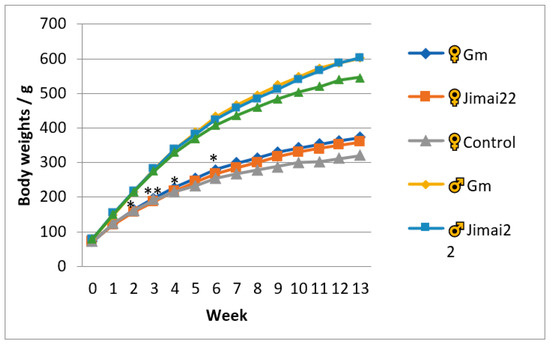 Weekly body weights of female and male animals in three groups. * represents p < 0.05 compared with Jimai22 group; ** represents p < 0.01 compared with Jimai22 group.