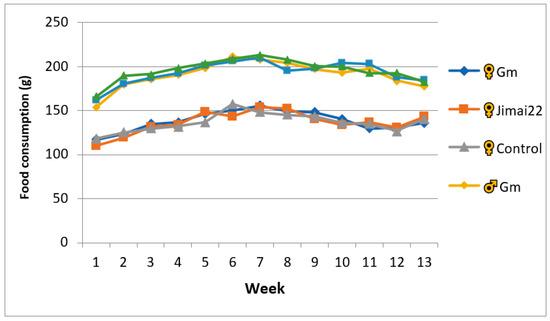 Throughout the experiment, there were no toxicity-related signs observed in any group. The increase trends of body weights in the three groups were similar. Compared with the Jimai22 female group, the body weights of the Gm female rats showed no significant differences except during weeks 2, 3, 4 and 6 (p < 0.05 or p < 0.01). The body weights exhibited no difference between Gm male rats and Jimai22 male rats. In addition, no significant differences were observed in weekly food consumption of rats in the two wheat groups. The results are shown in Figure 1 and Figure 2.