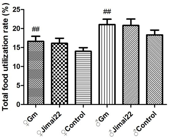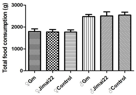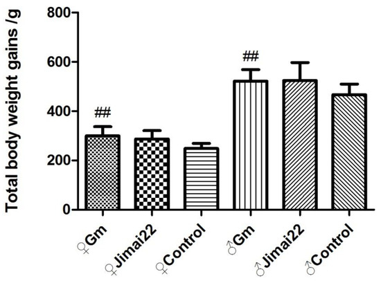 There were no significant differences between the Gm group and Jimai22 group (p > 0.05) in total body weight gains, total food consumption or total food utilization rate. Compared with the AIN-93 control group, the total body weight gains and total food utilization of the Gm group (females and males) were both significantly higher (p < 0.01, p < 0.01), but total food intake of Gm females and Gm males displayed no difference (p > 0.05). The results are shown in Figure 3, Figure 4 and Figure 5.