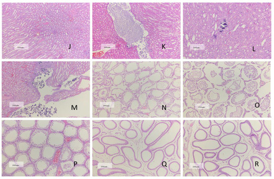 Non-specific histopathological changes in rats at week 13. (A): slight interstitial inflammation of lung in Jimai22 group; (B): Slight glandular dilatation of stomach in Jimai22 group; (C): slight inflammatory cells infiltration of liver in Jimai22 group; (D,E): slight hepatic vacuolation in Jimai22 and Gm group; (F–H): slight renal interstitial inflammatory cell infiltration in Control, Jimai22 and Gm group, respectively; (I,J): Slight renal hyaline casts in Jimai22 group and Gm group; (K–M): slight renal calcium deposition in Control, Jimai22 and Gm group, respectively; (N–P): testicular atrophy in Control, Jimai22 and Gm group, respectively; (Q,R): epididymal sperm loss in Control, Jimai22 group.