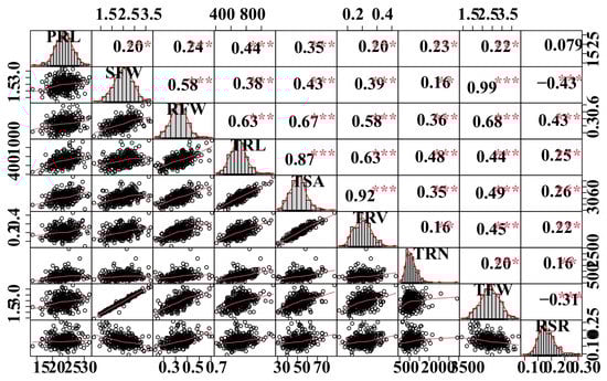 Correlation analyses between root-related traits. The plots on the diagonal line show the frequency distribution of the traits. Above the diagonal line are Pearson correlation coefficient values between traits, and the plots below the diagonal line indicate the scatter plots of the root-related traits. **, *** are significant differences at p < 0.05, p < 0.01, and p < 0.001, respectively. Refer to Table 1 for the definition of the terms.