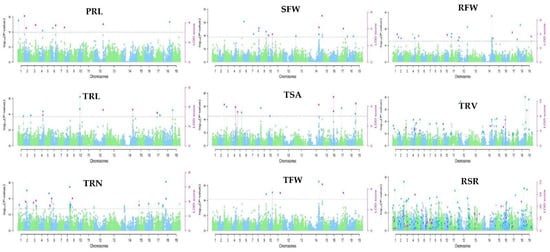 Manhattan of phenotype–genotype association analysis using six multilocus GWAS approaches for nine root-related traits of B. napus. The 19 chromosomes from A01–A10 and C01–C09 are represented by varied green and blue colors in the plots; the thick horizontal lines represent the logarithm of odds (LOD) threshold of ≥3. Significant SNPs are indicated by colored dots above the threshold values. The green and blue dots above the threshold line represent significant SNPs by the threshold (log101/21,242 = 4.33 × 10−5, while the pink dots show significant SNPs by the threshold LOD ≥ 3.