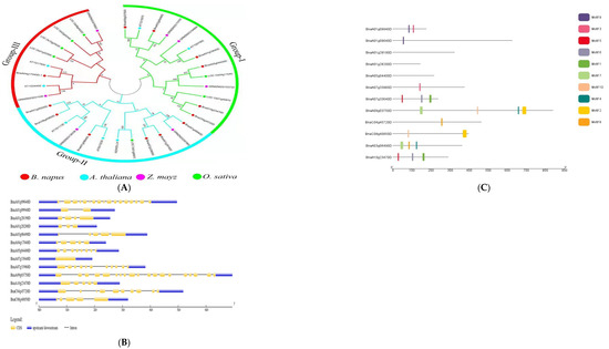 Analysis of candidate genes. (A) Genes from B. napus, A. thaliana, Oryza sativa, and Zea mays are shown in a phylogenetic tree with subgroups. The phylogenetic tree was built with MEGA 7 software using the neighbor-joining method with a bootstrap value of 1000. The bootstrap values are indicated by the numbers next to branches. (B) The distribution of exons and introns in the genes. (C) Motif analysis of candidate genes in B. napus. The various colors represent the various sorts of motifs that the genes possess.