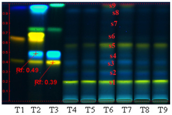 Qualitative assessment of polyphenolic compounds distribution in the three extracts obtained from Plantago lanceolata, by HPTLC analysis. T1: quercetin-3-O-rutinoside/rutin, quercetin-3-O-galactoside/hyperoside and gallic acid; T2: quercetin-3-O-rutinoside/rutin, chlorogenic acid, quercetin-3-O-galactoside/hyperoside, luteolin-7-O-glucoside/cynaroside, apigenin-8-C-glucoside/vitexin, caffeic acid; T3: rutin, chlorogenic acid, apigenin-7-O-glucoside/cosmosiin and kaempferol; T4–T5: polysaccharides fraction PP; T6–T7: polyphenols fraction PF; T8–T9: iridoids fraction PI.