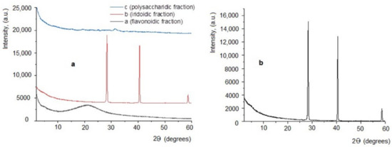 X-ray diffraction analysis. (a) Diffractograms obtained for extracts of Plantago lanceolata: a = PP; b = PI; c = PF; (b) Diffractogram details from the sample PI (iridoidic fraction).