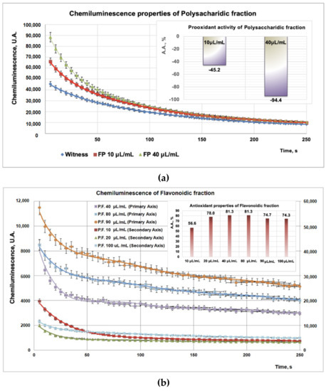 Due to the high sensitivity and rapidity, the addition of compounds into a chemiluminescence (CL) system leads to the reduction of the CL emission, thus scavenging the reactive oxygen species. Experimental data on PP/PF/PI fractions obtained from CL studies revealed a strong antioxidant effect for the PF fraction (Figure 3b inset) for all tested doses (10–100 μL), whereas, for the PP (tested doses, 10–40 μL) and PI (tested doses, 10–50 μL) samples, a strong prooxidant effect was observed (Figure 3a inset, Figure 3c inset). Moreover, the prooxidant effect of the PP fraction (Figure 3a inset) is more pronounced than that of the PI fraction (Figure 3c inset).