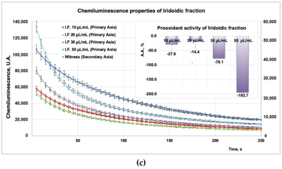 (a). Studies regarding chemiluminescence/prooxidant properties of PP fraction. (b) Studies regarding chemiluminescence/antioxidant properties of PF fraction (with the same witness as in (a)). (c) Studies regarding chemiluminescence/prooxidant properties of PI fraction.