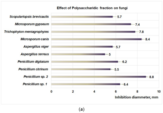 Moderate effects of the PF fraction were also observed for micromycetes (Figure 4b) such as A. terreus (inhibition diameter 8.8 mm) followed by P. citrinum (inhibition diameter 8 mm), P. digitatum (inhibition diameter 7.9 mm), A. niger (inhibition diameter 6.9 mm), Penicillium sp. 2 (inhibition diameter 6.8 mm), and Penicillium sp. 1 (inhibition diameter 6.1 mm).