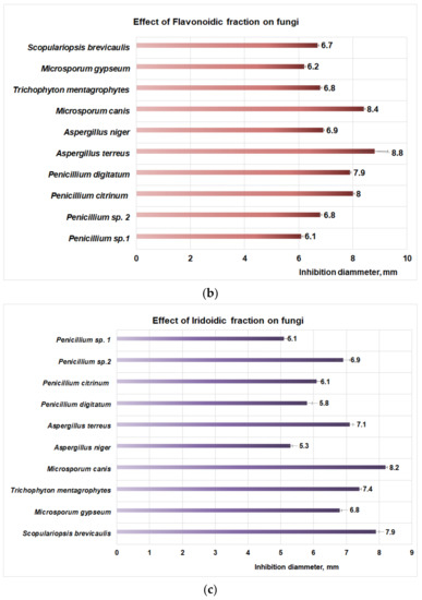 (a) The effect of polysaccharidic fraction on different fungal strains. (b) Effect of flavonoidic fraction on different fungal strains. (c) Effect of iridoidic fraction on different fungal strains.
