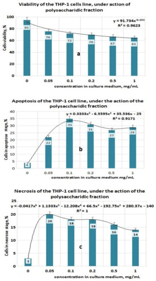 Effect of exposure at PI fraction on THP–1 cell lines. (a) Viability of THP–1 cell line under action of PI fraction; (b) Apoptosis of THP–1 cell line under action of PI fraction; (c) Necrosis of THP–1 cell line under action of PI fraction.