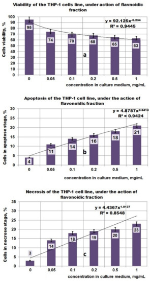 Effect of exposure at PP fraction on THP–1 cell lines. (a) Viability of THP–1 cell line under action of PP fraction; (b) Apoptosis of THP–1 cell line under action of PP fraction; (c) Necrosis of THP–1 cell line under action of PP fraction.