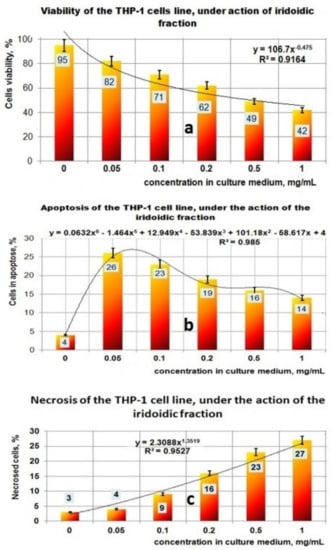 The results obtained in the case of the fraction which contains iridoidic compounds (Figure 7a–c) are much more spectacular. Under the action of PI bioproduct in the range of (0–1) mg/mL, the viability of the THP-1 cell line decreased from 95% to 42%; this process can be mathematically approximated with a decreasing power function (Figure 7a). Regarding the influence of the PI fraction on apoptosis, the results indicated a maximum effect at 0.05 mg/mL when 26% of the THP-1 cell line found it in the apoptotic stage (Figure 7b). At a concentration greater than 0.05 mg PI/mL, the apoptotic process decreased until 14% for 1 mg PI/mL. This apoptotic process due to the presence of PI bioproduct in the studied concentration range can be well described by a polynomial function of degree six (Figure 7b). The necrosis process of THP-1 cells due to the presence of PI in the culture medium is characterized by an increasing power function, and ranged from 3% for 0 mg PI/mL to 27% at 1 mg PI/mL (Figure 7c).