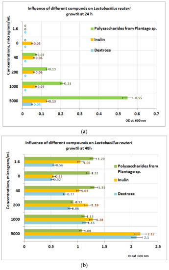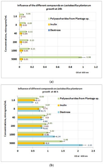 At 48 h of exposure, the measurements performed reveal that in the concentration range of 1–5 mg/mL the L. plantarum growth is best influenced in the presence of dextrose, followed by PP bioproduct (Figure 8b). For a concentration range situated between (1.6 ÷ 200) μg/mL, the best results regarding the L. plantarum growth were obtained for PP bioproduct followed by dextrose and inulin. The obtained results are probably due to the intensification of the depolymerization processes of the PP bioproduct, under the action of metabolic compounds resulting from L. plantarum growth, processes followed by the appearance of monosaccharides in culture medium, which are more accessible for probiotic strain.