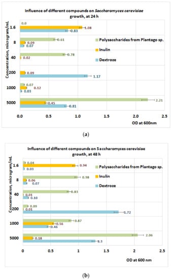 For screening activities, 24-well microplates were used; for Lactobacillus sp. we used liquid MRS medium with or without dextrose; for Saccharomyces sp. we used YPG medium with or without dextrose. Into each well of the plate, the same volume of MRS or YPG medium with or without dextrose was distributed. In each well, a serial dilution was made with a volume of 0.25 mL sterile water (in the case of culture medium with dextrose) or with sterile stock solution, which contains PP or inulin. The solutions which contain polysaccharides, inulin, or dextrose were made in sterile water. Each row of the plate had the following concentrations of prebiotics (μg/mL): 5000; 1000; 200; 40; 8; and 1.6. In each well, the inoculum of the studied probiotic strain was evenly distributed, at the rate of inoculation of 1:10, from each probiotic strain, which contains 4 × 108 CFU/mL. As a reference, the culture mediums MRS (for Lactobacillus sp.) or YPG (for Saccharomyces sp.) were used. The influence of PP, inulin, and dextrose on each probiotic microorganism was studied by replacing dextrose from MRS or YPG with PP or inulin, using serial dilutions. All tests were made in three replications, and each measurement was performed three times. The OD (optical density) of the well plate was measured after 24 h and 48 h at 620 nm using a DYNEX plate reader (DYNEX Technologies, MRS, VA, USA).