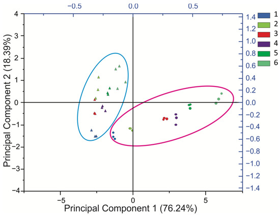 Principal component analysis (PCA) scatter plot of the first two coordinates based on ten morphological characteristics measured in plants of A. angustifolia and A. potatorum of different ages. Circles within the pink oval indicate A. angustifolia plants, while triangles within the blue oval indicate A. potatorum plants. The numbers and colors outside the graph indicate the age of the plants.