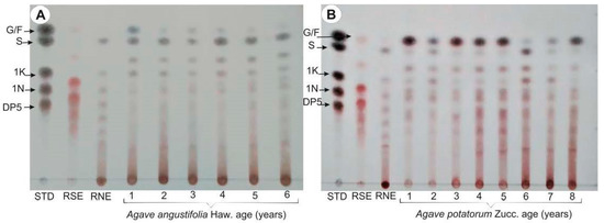The carbohydrate profiles of A. angustifolia Haw. and A. potatorum Zucc. plants (1−6-year-old plants) were identified by thin layer chromatography (TLC) (Figure 3). The fructan extracts were compared with a standard mixture (STD: G, glucose; F, fructose; S, sucrose; 1K, 1-kestose; 1N, nystose; and DP5), as well as commercial inulins of short (SDP) and high (HDP) degrees of polymerization (RSE, raftilose and RNE, raftiline, respectively). The carbohydrates were identified by their retention factors (Rf values) and spot colors: glucose (Rf = 0.81, bluish color), fructose (Rf = 0.81, reddish), sucrose (Rf = 0.75, brown), 1-kestose (DP3) (Rf = 0.5, brown), 1-nystose (DP4) (Rf = 0.43, brown), and 1-kestopentaose (DP5) (Rf = 0.37, brown). The color intensity was related to the carbohydrate’s type and abundance. TLC showed that the profiles of A. angustifolia and A. potatorum fructans (Figure 3) displayed a different profile when compared to RSE and RNE. This was because RSE is composed mainly of FOS of the Fn series (without a glucose unit) and RNE is composed mainly of GFn of the inulin fructan series, with a HDP, while agave fructans are a complex mixture of FOS and HDP fructans. Spots corresponding to glucose, fructose, and sucrose appeared in all samples, independently of the species. TLC analysis showed that 1−2-year-old A. angustifolia plants (Figure 3A) mainly stored SDP fructans, while the most abundant carbohydrates in 3−6-year-old plants were HDP fructans. The fructose/glucose spots were most intense in 1-year-old plants. TLC also showed that 1−3-year-old A. potatorum plants (Figure 3B) mainly stored SDP fructans, while the most abundant carbohydrates in 4−6-year-old plants were HDP fructans. Therefore, in general, fructans appear to have a higher DP in the adult plants of both species.