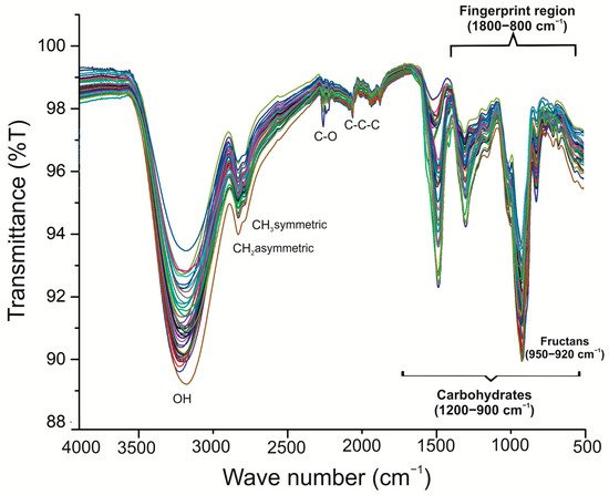 Fourier-transformed mid-infrared spectra were obtained using a Cary 600 FT-IR spectrometer (Agilent Technologies, Folsom, CA, USA) equipped with an attenuated total reflectance (ATR) accessory and a diamond/Ge crystal plate (Agilent Technologies, Folsom, CA, USA) (MIRacle by PIKE Technologies, USA). For measurements, 50 mg of each sample was placed onto the ATR crystal plate and 32 scans were recorded in the range of 4000–600 cm−1 at a nominal resolution of 4 cm−1 in transmittance mode (%T). Single-beam spectra of all samples were collected using air as the reference background. After each measurement, the crystal was cleaned with pure ethyl alcohol and dried using a paper towel. In order to make sure the ATR crystal was clean; a spectrum was collected using the latest background as the reference. Three replicate measurements of each sample were taken and the spectra were averaged. Principal component analysis (PCA) was performed in the Pirouette software. Principal component models were developed for different regions of the FT-IR: carbohydrates (1300–900 cm−1) and fructans (959–920 cm−1).