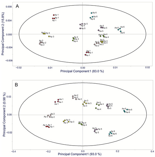 Principal component analysis (PCA) models for FT-IR spectra of agave fructans from A. angustifolia and A. potatorum plants of different ages. (A) Carbohydrate region (1300–900 cm−1); (B) fructan region (950–920 cm−1).