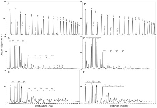 HPAEC-PAD profiles of fructans from (A,D) raftiline (RNE), (B) 1-year-old A. angustifolia plants, (C) 6-year-old A. angustifolia plants, (E) 1-year-old A. potatorum plants, and (F) 6-year-old A. potatorum plants.