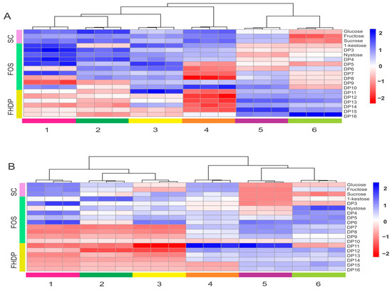 We analyzed samples of A. angustifolia and A. potatorum plants to assess the metabolic profiles as they relate to carbohydrates. To explore the carbohydrate metabolic changes in agave plants of different ages, their carbohydrate profiles were analyzed for specific differences. Hierarchical clustering and heatmaps of carbohydrate profiles helped to identify patterns in the metabolites that were enriched or depleted in samples of A. angustifolia and A. potatorum plants. The fold changes from the overall mean concentration for different ages are shown using color coding (Figure 7). The samples of A. angustifolia were grouped into two clusters: Cluster A, which had higher concentrations of simple carbohydrates (glucose, fructose, and sucrose) and FOS (kestose, nystose, and DP5), and Cluster B, which contained higher concentrations of FOS and fructans of a HDP (DP11–DP16) (Figure 7A). Furthermore, in observing the distribution patterns of the samples in the two clusters, the samples of 1-, 2-, and 3-year-old plants were mainly concentrated in Cluster A, and the samples of 4-, 5-, and 6-year-old plants were principally concentrated in Cluster B. This means that high metabolic differences existed between plants 1–3 years old and plants 4–6 years old. Similarly, two large clusters in A. potatorum plants were observed: Cluster A, which had higher concentrations of glucose, fructose, sucrose, and FOS (DP3–DP5), and Cluster B, which mainly contained greater concentrations of fructans of a HDP (DP11–DP16) (Figure 7B). In this case, samples of 1-, 2-, 3-, and 4-year-old plants were principally concentrated in Cluster A, and 5- and 6-year-old plants were concentrated in Cluster B.