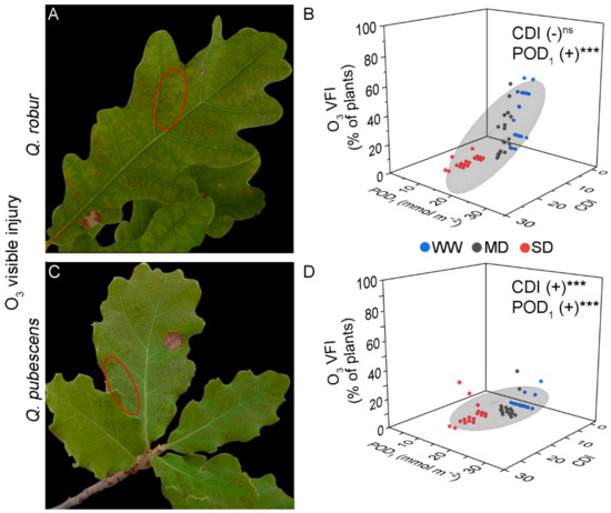 Illustrative examples of O3 visible foliar injury in Quercus robur (A) and Q. pubescens (C) characterized by small homogeneously distributed dots between the primary leaf veins (ellipse). (B,D) Results from the linear multiple regression of O3 visible foliar injury with Cumulative Drought Index (CDI) and phototoxic O3 dose (POD1) as predictor factors in Quercus robur (B) and Q. pubescens (D). Colored dots represent well-watered (WW-blue), moderate drought (MD-grey), and severe drought (SD-red). The grey ellipsoid represents a confidence level of 75%. (+) positive regression, *** = p < 0.001, ns = not significant.
