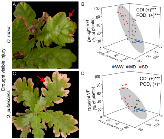 Illustrative examples of drought visible foliar injury in Q. robur (A) and Q. pubescens (C) characterized by dry and brownish leaf edges (arrow). (B,D) Results from the linear multiple regression of drought visible foliar injury with Cumulative Drought Index (CDI) and phototoxic O3 dose (POD1) as predictor factors in Q. robur (B) and Q. pubescens (D). Colored dots represent well-watered (WW—blue), moderate drought (MD—grey), and severe drought (SD—red). The grey ellipsoid represents a confidence level of 75%. (+) positive regression, * = p < 0.05, *** = p < 0.001, ns = not significant.