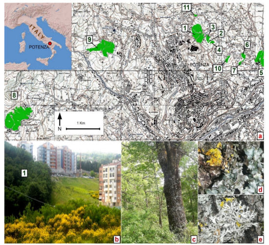 (a) Study area location: green patches are the 11 peri-urban Quercus pubescens woodlands sampled to assess their epiphytic lichens diversity and composition; forest patch numbers correspond to those in Table 1; (b) new urban areas in the periphery of Potenza city (Macchia Romana) close to the forest patch number “1” with flowering of Spartium junceum shrubs, which are recolonizing uncultivated areas; (c) Quercus pubescens tree at Macchia Giocoli (patch n. 8); (d) Pleurosticta acetabulum (Neck.) Elix & Lumbsch and Xanthoria parietina (L.) Th. Fr. on Q. pubescens; (e) Anaptychia ciliaris (L.) Flot, Physcia adscendens (Fr.) H.Olivier, and Xanthoria parietina (L.) Th. Fr. on Q. pubescens bark.