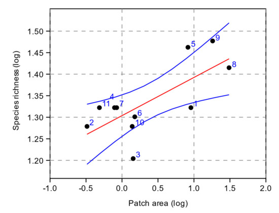 The size of the forest fragment was a significant and positive predictor of species richness, in agreement with several other studies, e.g., [49,50,51] in particular with data on vascular plants’ distribution in a Mediterranean forest ecosystem [49].