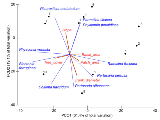 Finally, a multivariate analysis (PCoA; Bray-Curtis distance) was performed to explore the combined effect of the landscape, environmental, and forest structure variables on the structure and composition of lichen vegetation as a whole. Retained variables were standardized and superimposed to the ordination axes of PCoA. Aspect (slope exposure) was converted to radians and then to a southing index S with the formula S = −cos (aspect) + 1. Statistical analyses were performed using PAST 4.10 and PRIMER 6.1.11.