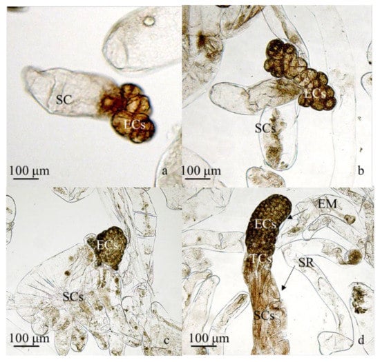 Characterization of the P. koraiensis embryogenic tissue. (a) PE I, bar = 100 μm; (b) PE II, bar = 100 μm; (c) PE III, bar = 100 μm; (d) ESE, bar = 100 μm. EM: embryo mass; TC: embryonic tube cells; SR: suspensor region; EC: embryonic cell; SC: suspensor cord-like cell.