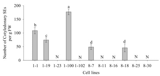 Number of cotyledonary SEs in different cell lines of P. koraiensis. Different letters above the columns indicate significant differences at the p < 0.05 level, and “N” indicates that the number of cotyledonary SEs was 0.