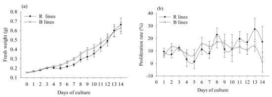 During embryogenic tissue proliferation, the FW change of the embryogenic tissue was used to compare the proliferation of R and B cell lines. We found that R and B cell lines showed similar patterns during the proliferation stage (Figure 3a). R cell lines reached the peak proliferation rate on the 8th and 13th days of culture, while B cell lines reached it on the 6th and 8th days of culture (Figure 3b).