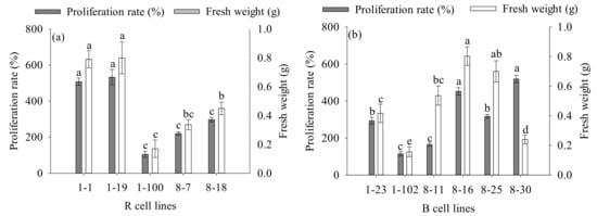 Differences in FW and proliferation rate of different cell lines of P. koraiensis after 14 days of proliferation. (a) R cell lines; (b) B cell lines. Different letters above the column indicate significant differences at the p < 0.05 level.