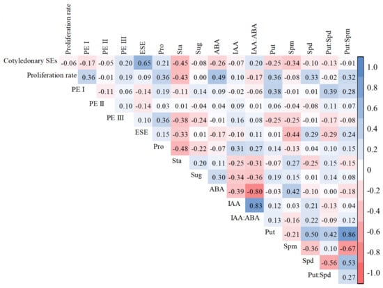 Based on the aforementioned results, we discovered that PE III and ESE numbers, soluble protein content, and Put: Spd ratio in R cell lines were significantly higher than those in B cell lines, whereas the starch, IAA, Put, and Spd contents and Put: Spm ratio in R cell lines were significantly lower than those in B cell lines. In addition, we analyzed the correlation between each indicator and cotyledonary SE yield and found that PE III and ESE numbers and soluble protein content were significantly positively correlated with SE yield, whereas the starch, ABA, Put, Spm, and Spd contents were significantly negatively correlated with cotyledonary SE yield. Therefore, we infer that PE III and ESE, soluble protein, starch, IAA, ABA, Put, Spd and Spm contents, and Put: Spd and Put: Spm ratios are closed related to SE yield.