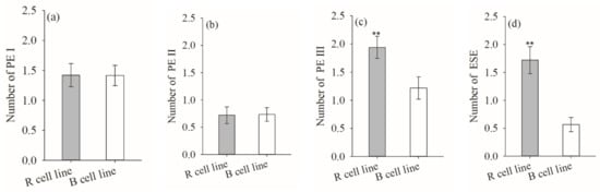 Differences in the numbers of PE I, PE II, PE III, and ESEs between P. koraiensis R and B cell lines. ** indicates that the difference is significant at the p < 0.01 level.