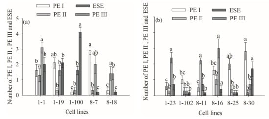 Differences in the number of ESEs between different cell lines of P. koraiensis. (a) R cell lines; (b) B cell lines. Different letters above the column indicate significant differences at the p < 0.05 level.