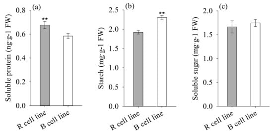 Differences in soluble protein, starch, and soluble sugar contents between P. koraiensis R and B cell lines. ** above the column indicates that the difference is significant at the p < 0.01 level.