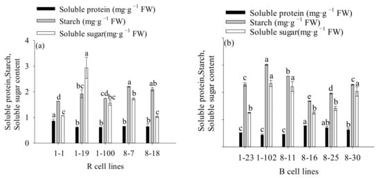 Differences in soluble sugar, starch, and soluble protein contents between different cell lines of P. koraiensis. (a) R cell lines; (b) B cell lines. Different letters above the bar indicate significant differences at the p < 0.05 level.