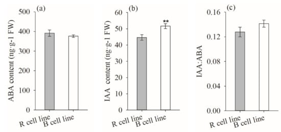 The IAA content in B cell lines was significantly higher (1.2-fold) than that of R cell lines (p = 0.003). There was no significant difference in ABA content and IAA: ABA ratio between R and B cell lines (Figure 10).