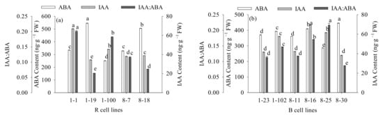 Differences in ABA and IAA contents between different cell lines of P. koraiensis. (a) R cell lines; (b) B cell lines. Different letters above the columns indicate significant differences at the p < 0.05 level.