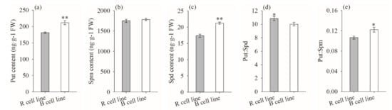 Differences in Put, Spm, and Spd contents, as well as the Put: Spd and Put: Spm ratios between P. koraiensis R and B cell lines. ** above the column indicates that the difference is significant at the p < 0.01 level, and * above the column indicates that the difference is significant at the p < 0.05 level.
