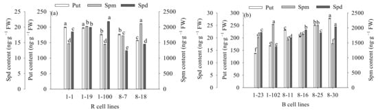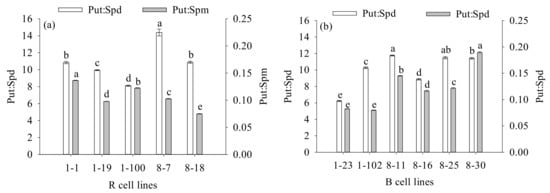 Differences in the Put: Spd and Put: Spm ratios between different cell lines of P. koraiensis. (a) R cell lines; (b) B cell lines. Different letters above the column indicate significant differences at the p < 0.05 level.