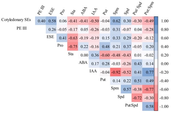 The highest values were observed in the 8-30, 1-102, and 8-30 cell lines, respectively (mean = 277.80 ng·g−1 FW, 2115.96 ng·g−1 FW, and 24.34 ng·g−1 FW, respectively; Figure 13). It was also found that the Put content was negatively correlated with cotyledonary SE yield (R = −0.249, p = 0.009) and the PE III number (R = −0.252, p = 0.008), while it was positively correlated with the PE I number (R = 0.375, p < 0.001). The Spm content was negatively correlated with cotyledonary SE yield (R = −0.343, p < 0.001) and the numbers of PE III (R = −0.253, p = 0.008) and ESEs (R = −0.440, p < 0.001). The Spd content was positively correlated with the number of ESEs (R = 0.289, p = 0.002; Figure 5).