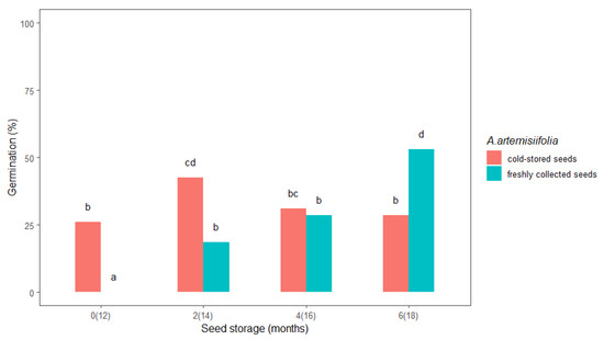 The effect of storage duration on freshly collected and cold-stored Ambrosia artemisiifolia seeds. The estimated marginal means of eight replicates are shown (standard error = 3.1). The means that are labelled with the same letter are not significantly different (p < 0.05) according to Tukey’s test. Numbers on the x-axis indicate the months of seed storage for the freshly collected seeds and the total months of storage in parentheses for the cold-stored seeds.