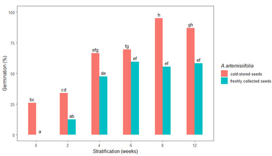 Total germination 14 days after sowing of freshly collected or cold-stored Ambrosia artemisiifolia seeds at different stratification intervals (0, 2, 4, 6, 8, and 12 weeks). The estimated marginal means of eight replicates are shown (standard error = 4.49). Means following the same letter are not significantly different (p < 0.05) according to Tukey’s test.