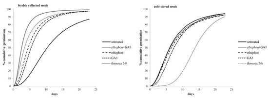 Cumulative germination over 14 days of the freshly collected or cold-stored seeds of A. artemisiifolia that were treated or not treated with chemical treatments. The lines represent logistic models that were generated with the statistical program Bioassay (97).